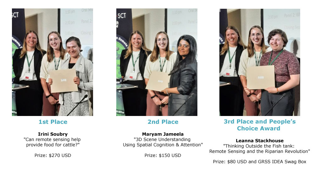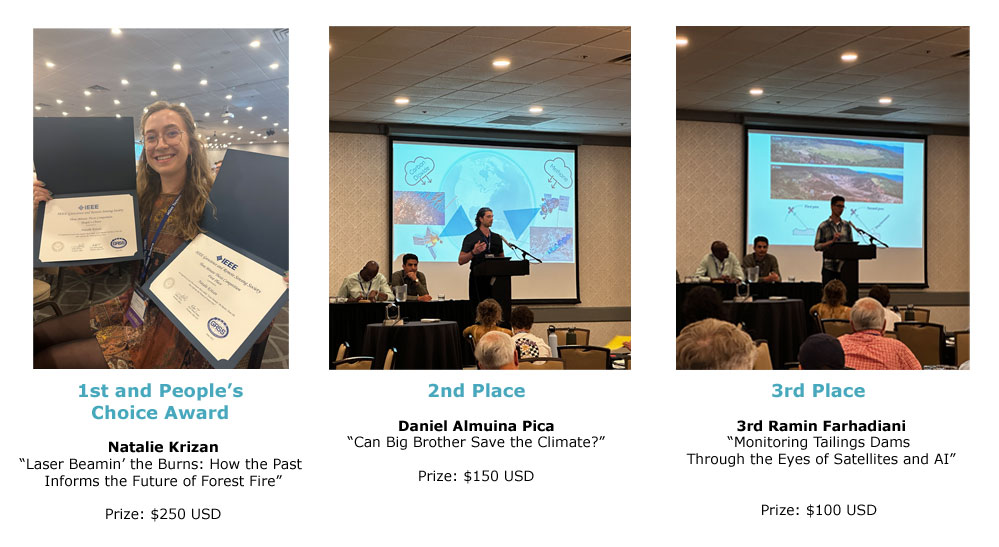 Congratulations to the 2025 award winners: Natalie Krizan, Daniel Almuina Pica, and Ramin Farhadiani, who each received a monetary prize sponsored by IEEE GRSS IDEA and an official IEEE-accredited certificate. Special congratulations to the People’s Choice Award winner, Natalie Krizan, who also received an IEEE certificate and an IDEA Swag Box.