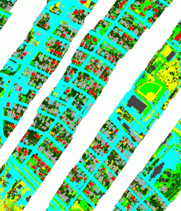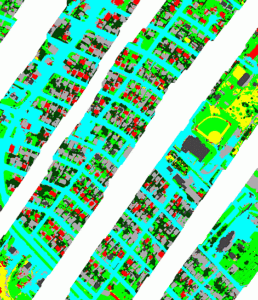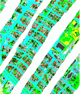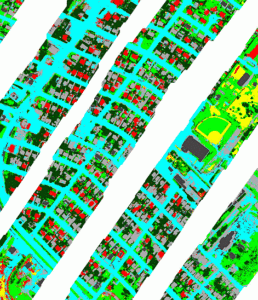 Abstract: We chose a support vector machine (SVM) approach to classify hyperspectral thermal and multispectral visible range data. Features used included the first three bands from the MAF-MNF filtered LWIR data, the red-green-blue spectral signatures, GLCM statistics calculated from a panchromatic image, log-Gabor filters calculated at 4 different scales, and the Structural Feature Set. All input data was resampled to the spatial resolution of the visible raster data. The models were calibrated using bootstrapped training data and each class was derived in stages based on highest class probability (red – gray, vegetation – tree, bare soil – road, concrete). Intermediate label outputs from the SVM were then post-processed using contextual, cell-based statistics.