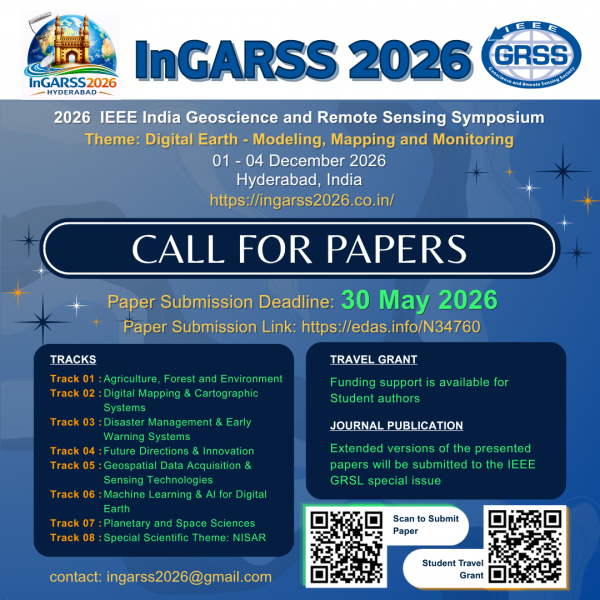 We are excited to announce that submissions are now open for the IEEE India Geoscience and Remote Sensing Symposium (InGARSS 2026), to be held in Hyderabad, India from 01–04 December 2026.