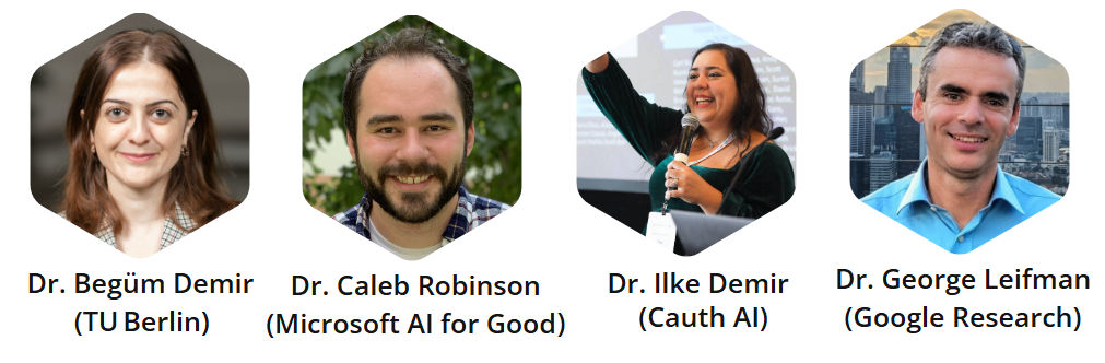 Dr. Begüm Demir is a Full Professor at Technische Universität Berlin (TU Berlin) in Germany, where she serves as the founder and head of the Remote Sensing Image Analysis (RSiM) research group within the Faculty of Electrical Engineering and Computer Science. In addition, she leads the Big Data Analytics for Earth Observation research group at the Berlin Institute for the Foundations of Learning and Data (BIFOLD). Dr. Caleb Robinson is a Principal Research Science Manager at the Microsoft AI for Good Research Lab and co‑leads the Geospatial Machine Learning group, focusing on tackling large scale applied problems at the intersection of remote sensing and machine learning/computer vision. Dr. Ilke Demir (Cauth AI) is a Senior Research Scientist whose work spans computer vision, generative models, deep learning, and geospatial machine learning. Dr. George Leifman is a Research Scientist at Google Research focused on developing vision‑language foundation models for satellite and aerial imagery, bringing experience in machine learning and large‑scale vision systems. Together, the keynote speakers bring experience from academia, industry research labs, and applied AI initiatives focused on real-world impact.