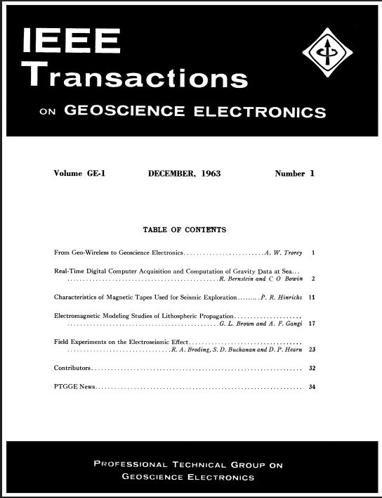 That same year, G-GE launched its flagship journal, “IEEE Transactions on Geoscience Electronics,” edited initially by Alan G. Trorey of the University of Toronto. The first issue was released in May 1963 and included a positioning article by Trorey as well as three other papers on radar altimetry, subsurface sensing, and electronic oceanography. A copy of the 1964 IEEE Transactions on Geoscience Electronics could be purchased for $2.25 and the annual member subscription price was $12.75. As would be expected, paper submissions were limited for the first few issues, with four papers in volume GE-1 No. 1 (one written by Alan Trorey, and only three papers in volume GE-2 No. 1 (November 1964). Trorey’s article was entitled, “From Geo-Wireless to Geoscience Electronics,” and stated that “both from the point of view of the electronic scientist and the ‘geo’ scientist, that geo, in modern day parlance, no longer means of the earth but means anywhere, since that which occurs anywhere may have an effect on earth.” This early publication soon established a strong scholarly foundation that continues through today’s IEEE Transactions on Geoscience and Remote Sensing (TGRS).