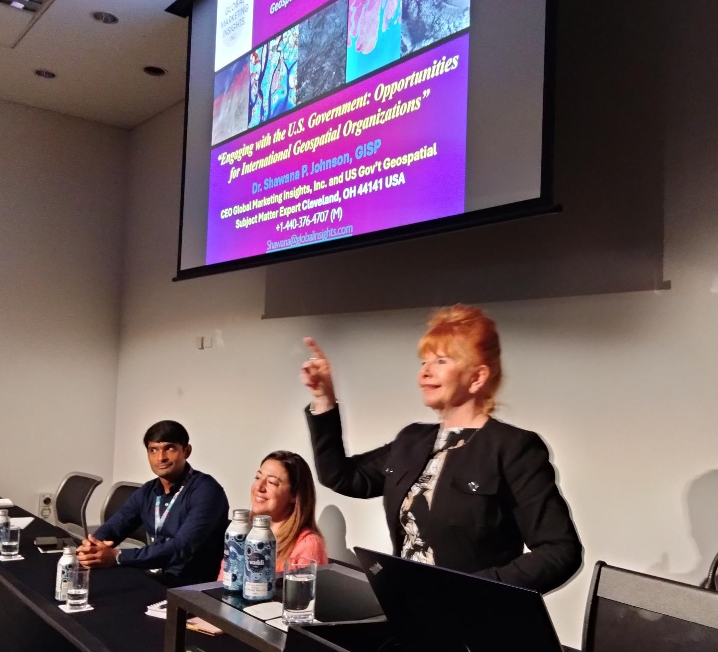 Dr. Shawana Johnson, who is a successful entrepreneur in her own right as president of Global Marketing Insights in Ohio, USA, wrapped up the session with a slightly different business startup topic. Leaning on her years of experience supporting geospatial organizations in building commercial businesses, Shawana focused on the challenging topic of how a non-U.S. company can engage in a business relationship with the U.S. government.