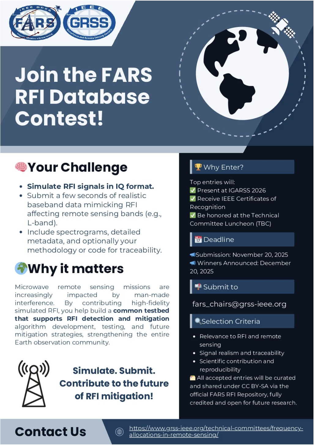 GRSS FARS-TC is organizing a contest to generate RFI signals of interest. The objective is to build a portfolio of IQ-format signals representative of typical RFI observed in remote sensing bands, creating a common testbed for RFI detection and mitigation techniques.